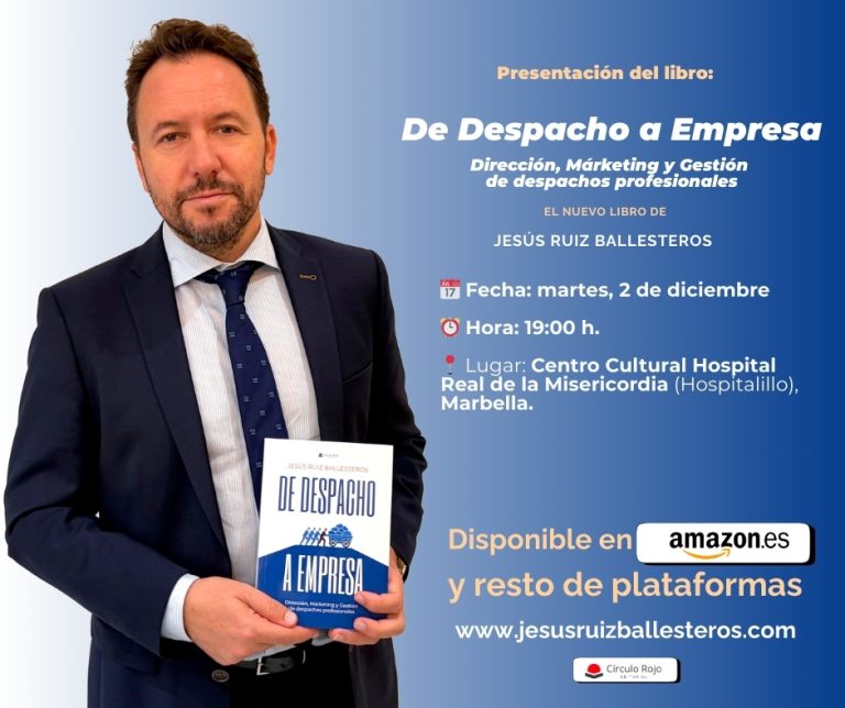 Queremos invitaros a la presentación del libro “DE DESPACHO A EMPRESA. Dirección, marketing y gestión de despachos profesionales”, de nuestro socio y fundador, Jesús Ruiz Ballesteros.